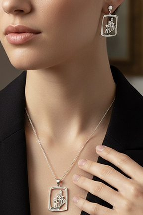 در این نیم ست نقره، معماری به زیور بدل شده است. هر قطعه با الهام از خطوط بناهای کلاسیک طراحی شده—قابهایی از نقرهی خالص که پنجرهای به جهان خیال میگشایند. آویز و گوشوارهها با برشهای دقیق و فرمهای هندسی، یادآور سکوت باشکوه سازههایی هستند که در دل تاریخ ایستادهاند.